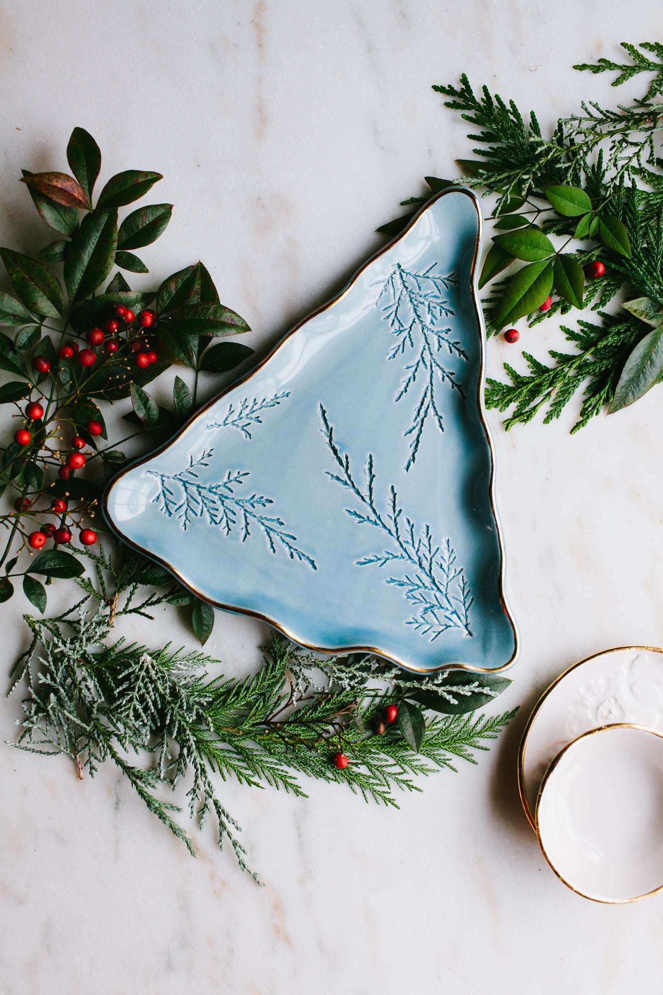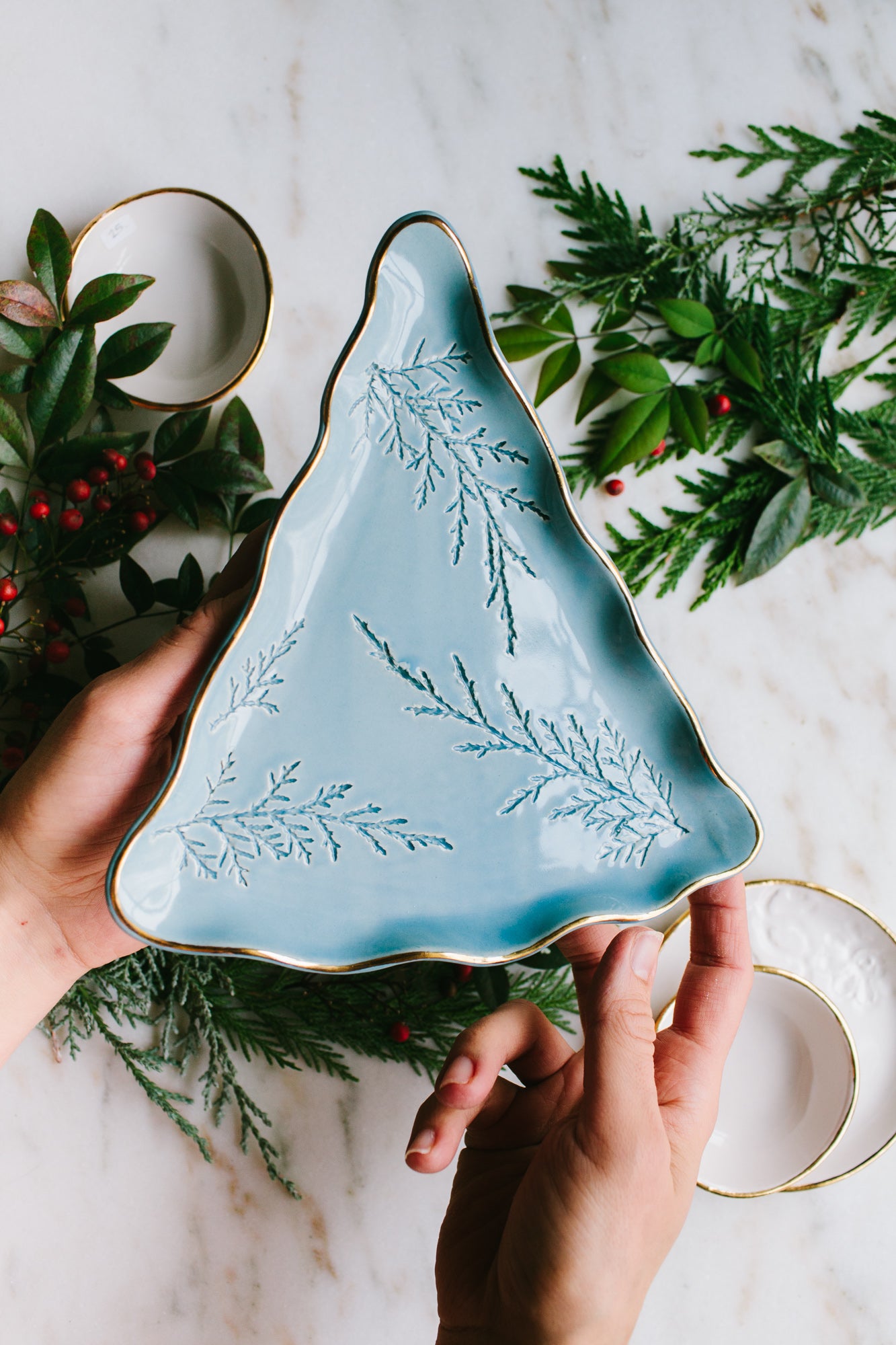 NEW festive Christmas tree-shaped candy tray, adorned with shimmering gold accents and dipped in our NEW blue glaze, is the perfect piece for your holiday celebrations. Designed to showcase your favorite sweets, it adds a whimsical touch to any gathering, making it a delightful addition to your seasonal decor.