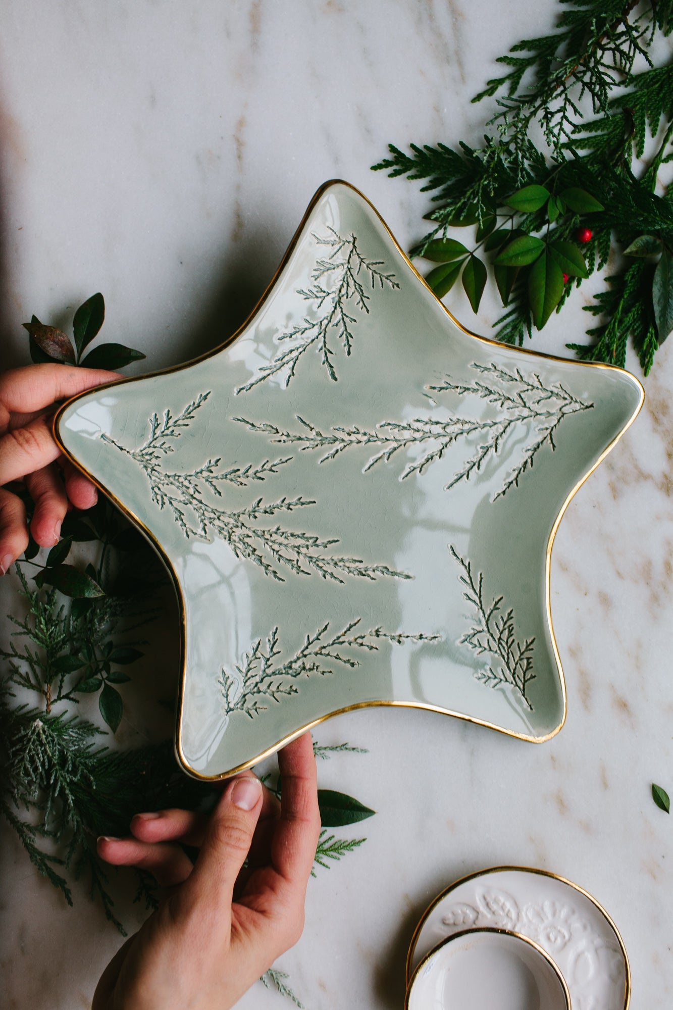 This festive star-shaped evergreen platter, adorned with shimmering gold accents and dipped in our classic moss glaze, is the perfect piece for your holiday celebrations. Designed to showcase your favorite sweets, it adds a whimsical touch to any gathering, making it a delightful addition to your seasonal decor.