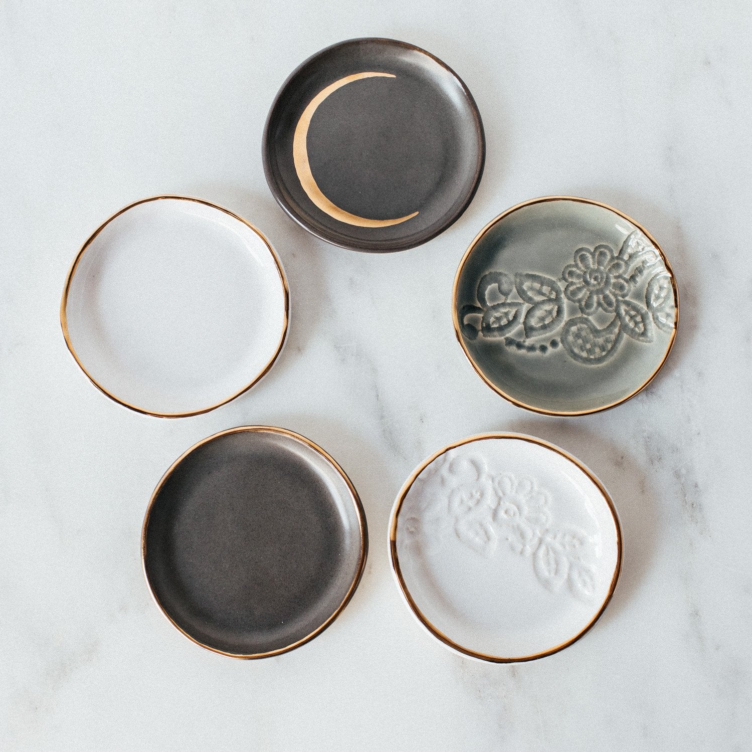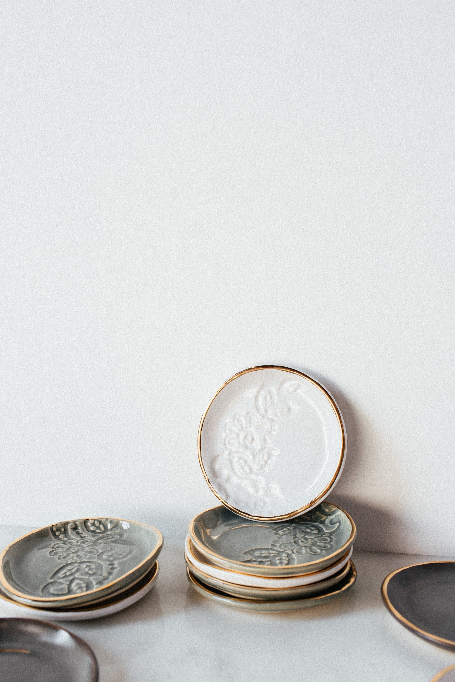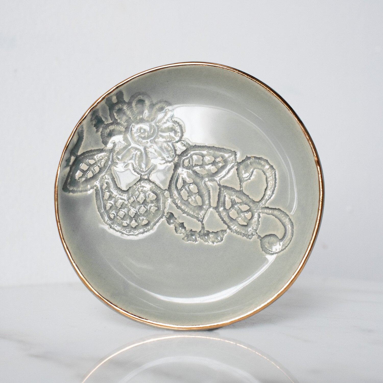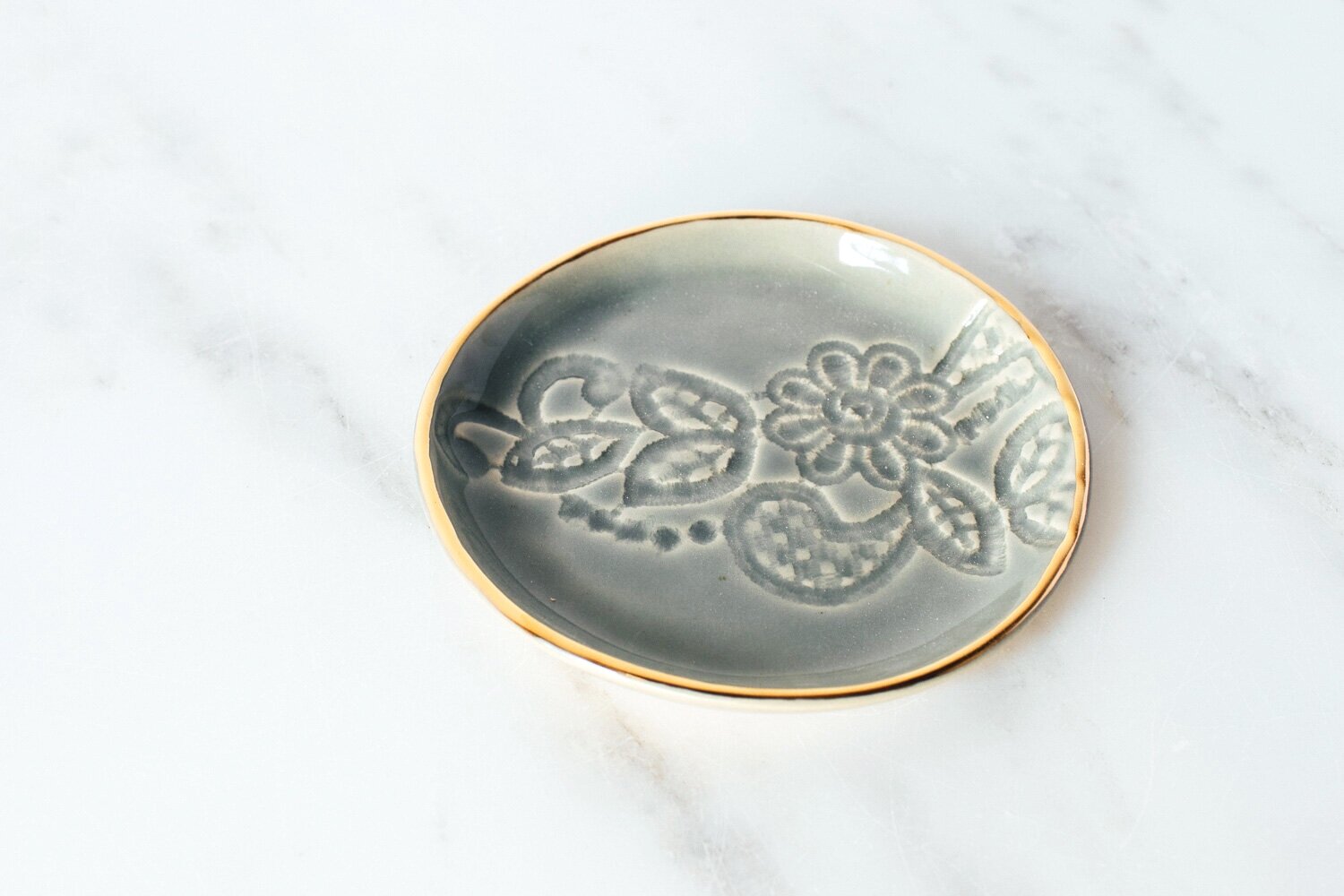This stunning handcrafted dish is the prettiest place to hold your favorite rings or jewelry. Impressed with lace from Romania, dipped in a green-gray glossy glaze and hand painted with a genuine gold rim.